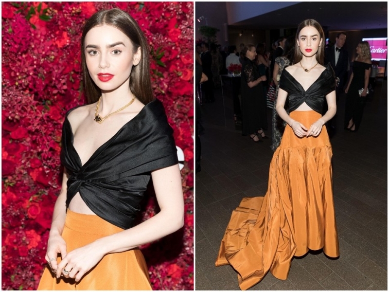 Лили Коллинз на мероприятии Cartier.Наряд Кэтрин Зеты-Джонс — тоже что-то из разряда БДСМ, смешанного с вариацией на голое платье. В свои 48 лет знаменитость прекрасно выглядит, но, во-первых, такая форма платья уже давно вышла из моды, во-вторых, уж очень странно выглядит само боди — так, будто юбка задралась и показала то, что на самом деле не хотели показывать.