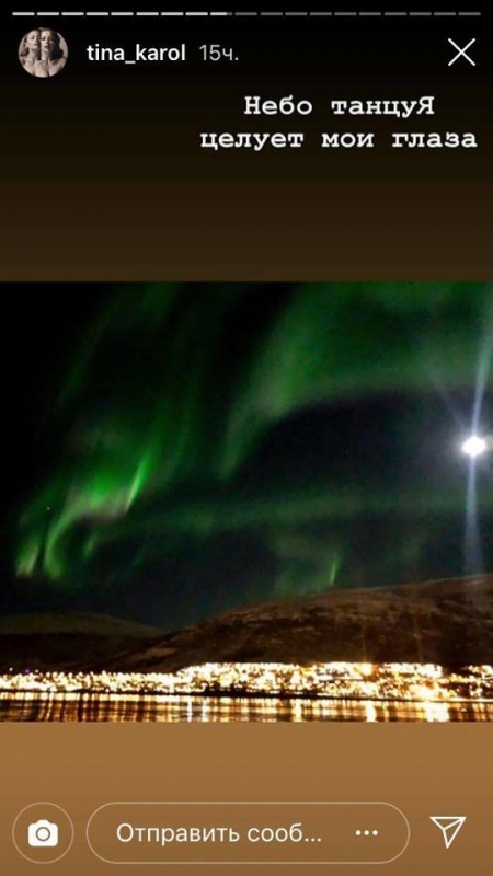 «Так я встретила свой день рождения. Это Северный полюс, северное сияние. Это я увидела на небе вчера ночью и сделала фото. Я придумала фразу: «Небо танцуя целует мои глаза». Это было именно так. Да, я сейчас за полярным кругом. Сделала себе такой подарок увидеть мечту детства. Прямо до слез. Оно двигается над головой и это космос, просто космос», — не сдерживая эмоций, написала Тина.