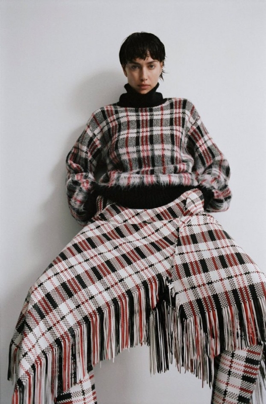 Модель примерила на себя несколько образов. Один из них — костюм в красно-серую клетку, напоминающую принт клетчатой сумки из 90-х.