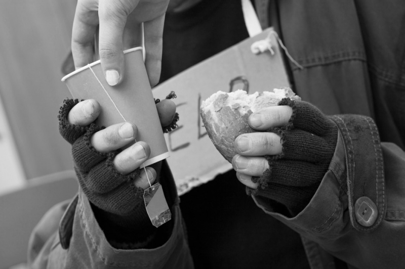 Не горячительный: алкоголь притупляет болевые ощущения, а не согревает. Подойдет чай, кофе. Можно купить еды, не требующей приготовления: консервы, которые можно открыть без помощи перочинного ножа, хлеб, колбасу, сыр. Неплохо также дать бездомному сладостей — глюкоза хотя бы немного компенсирует недостаток витаминов.
