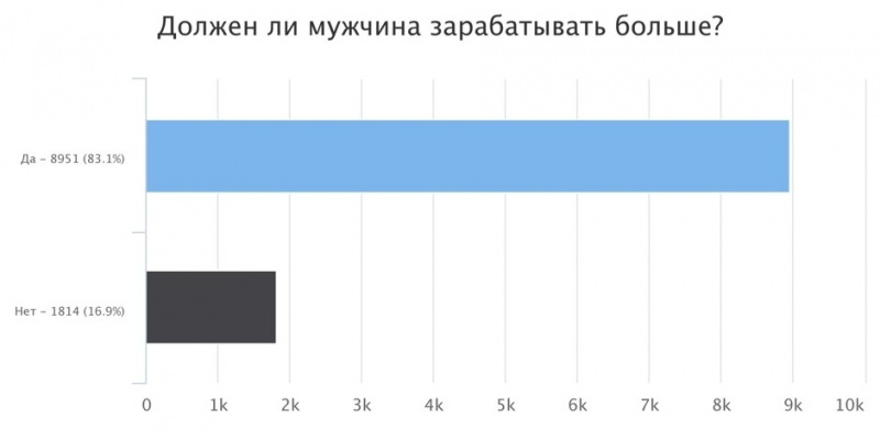В целом, 83.1% прошедших опрос считают, что мужчина должен зарабатывать больше. Очевидно, влияние стереотипа о «кормильце семьи» на женские умы по-прежнему сильно.