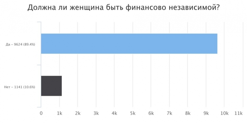 Судя по статистике, женщинам важно зарабатывать самим: 72.6% ответили, что не хотели бы бросать работу после замужества. А 89.4% опрошенных и вовсе считают, что женщина должна быть финансово независимой.