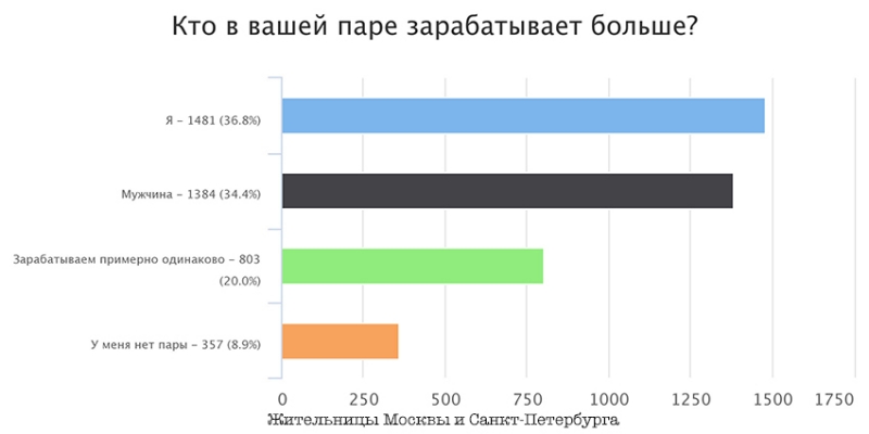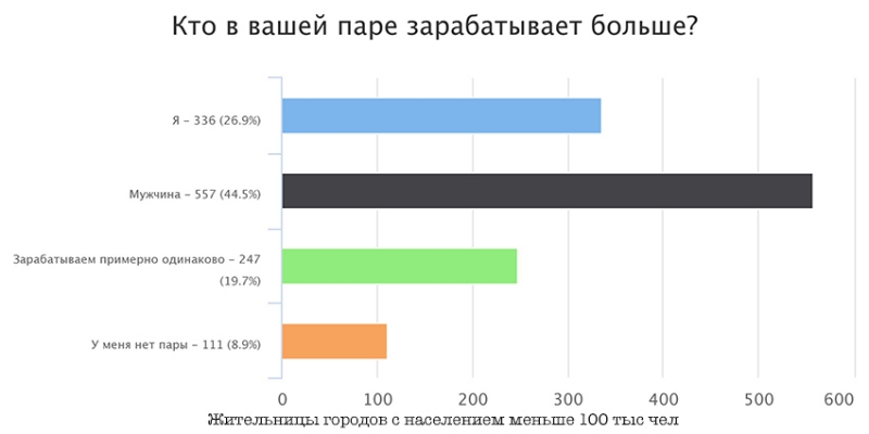 Феминизм говорит — будь самостоятельной. Патриархат — о тебе должен позаботиться мужчина. Мы решили выяснить, могут ли и хотят ли российские женщины зарабатывать сами.Как показал опрос, проведенный на сайте , и в котором приняли участие 11 517 человек, отношение к тому, кто сколько должен зарабатывать в семье, зависит от места проживания и возраста женщин. В целом, 83.1% прошедших опрос считают, что мужчина должен зарабатывать больше. Очевидно, влияние стереотипа о «кормильце семьи» на женские умы по-прежнему сильно. Тем не менее, если спросить женщин о том, важно ли им, чтобы зарплата их конкретного партнера была солиднее, цифра оказывается существенно меньше — 67.6%. То есть в реальной жизни мы более снисходительны к успешности любимого мужчины. Судя по статистике, женщинам важно зарабатывать самим: 72.6% ответили, что не хотели бы бросать работу после замужества. А 89.4% опрошенных и вовсе считают, что женщина должна быть финансово независимой. Напрашивается вывод, что российские женщины на мужчину надеются, но сами не плошают. И в основном, становятся надежной поддержкой и опорой своему спутнику — по крайней мере, в материальном плане. Те дамы, которые все же зарабатывают больше, в основном не переживают из-за этого. 28.9% сообщают, что им все равно, и только 17.1% теряют уважение к своему партнеру, если его доход меньше. Что касается реального положения дел, то в парах, живущих в регионах, чаще всего мужчины зарабатывают больше. 44.5% проголосовавших заявляют об этом. И только 34.4% жительниц столиц (Москва, Санкт-Петербург) сообщили, что их партнеры зарабатывают больше. Таким образом мы видим, что доход столичных женщин чуть солиднее. Двигай курсор вправо-влево, чтобы сравнить слайды: Интересная статистика наблюдается, если посмотреть на возраст женщин, проходивших опрос. На вопрос, «кто больше зарабатывает в вашей паре», 44.7% женщин возраста 24-30 лет ответили, что мужчина. Так же ответили 38.9% более взрослых читательниц, которым от 31 до 39 лет. Получается, чем взрослее женщины, тем больше увеличивается вероятность, что они будут зарабатывать больше своего партнера.