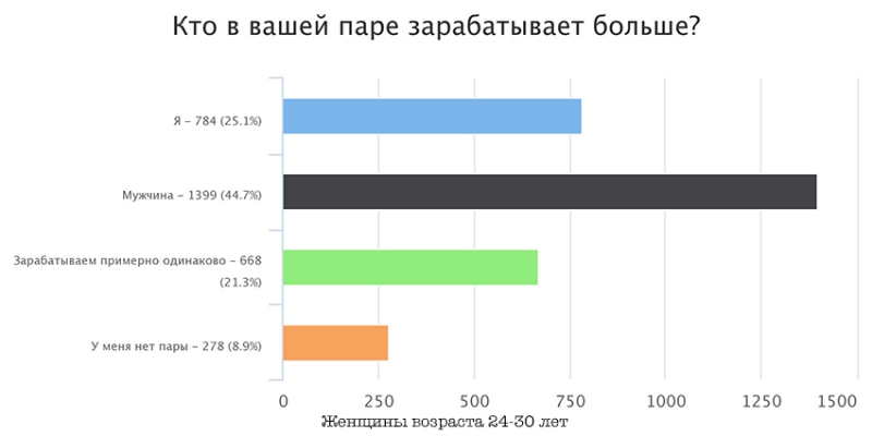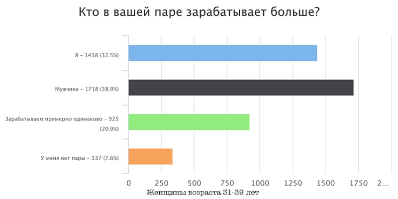 Интересная статистика наблюдается, если посмотреть на возраст женщин, проходивших опрос. На вопрос, «кто больше зарабатывает в вашей паре», 44.7% женщин возраста 24-30 лет ответили, что мужчина. Так же ответили 38.9% более взрослых читательниц, которым от 31 до 39 лет.
