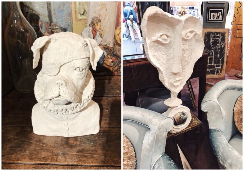 А эти скульптуры не антикварные, это творчество продавцов винтажных вещей, которые тут же на блошином рынке продают свои работы. Гипсовая собака высотой около 40 см стоит 500 евро, а вот лицо высотой около 80 см уже почти тысячу. Может быть, дело всего лишь в размере?!