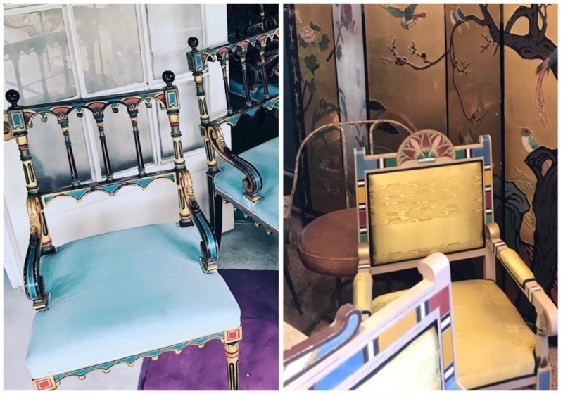 Стулья в египетском стиле. На левом сложная резьба, тонированная в разные цвета, а вот бархат на обивке новый. Цена — 1400 евро. На правом — роспись по дереву, формы более простые, ткань тоже новая, итого: 800 евро.