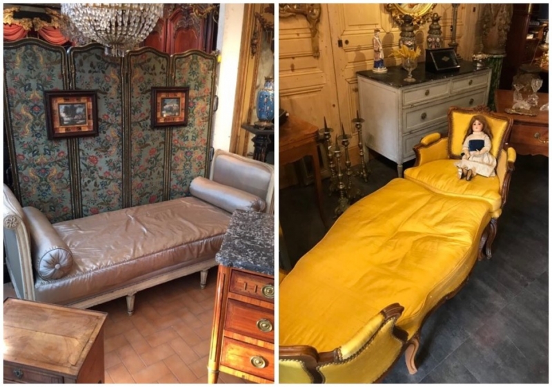 Французские кушетки, у которых сложно логически объяснить разницу в стоимости. Здесь имеет значение уровень магазина, понять который можно по соседним предметам на фото. Кушетка слева стоит — 4100 евро, а справа — 2700 евро.