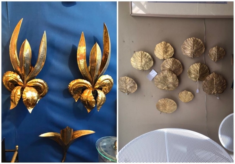 На этом коллаже представлены послевоенные настенные светильники в виде кувшинок и лилий. Кажется, что правые объемнее и сложнее, но на самом деле они сделаны из легкого листа металла и затонированы под латунь — 1200 евро. Левые — более ранние, бронзовые, с благородной патиной, цена — 600 евро.