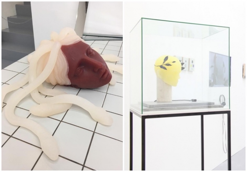 Слева: Голова Медузы Горгоны: снятие форм с пластилиновой скульптуры, переотливка в гипс, повторная формовка и переотливка в силиконе.Справа: Голова художника Олега Доу: снятие формы с живого объекта, переотливка в гипс, работа со скульптурой, переотливка в силиконе.