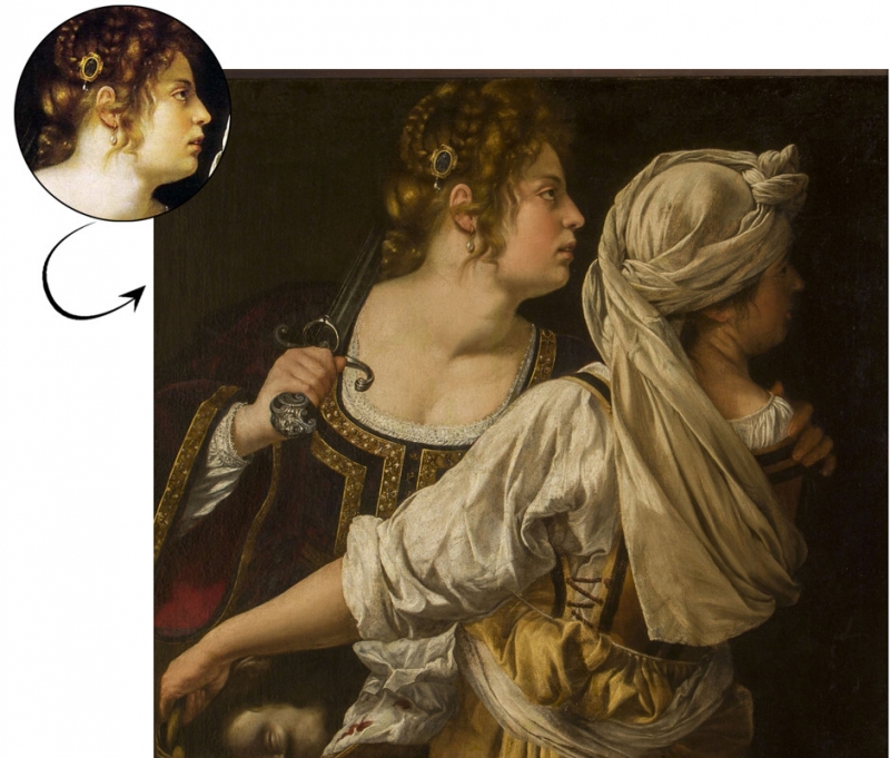 Этот автопортрет в роли Юдифь, убившей Олоферна, для нее своего рода терапия. Ее изнасиловал художник, у которого она проходила обучение, и боль этой травмы она изливала через творчество. Роль Юдифь для нее — это победа над мужчинами. Ее называют первой в мире феминисткой.