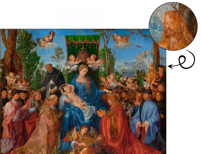Забавно, что на листке, который Дюрер держит в руках написано: «Я, Альбрехт Дюрер, написал картину «Праздник четок» за пять месяцев». Хотя по факту, писал он ее месяцев девять, не меньше.