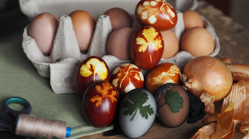 depositphotos.com— Очень просто. Берешь луковую шелуху. Onion peels. Кладешь в кастрюлю, наливаешь воды. Дальше берешь яйца. Укладываешь на каждое яйцо листочек сныти (bishop’s weed), надеваешь на яйцо со снытью чулок, чтоб не ерзало. Кладешь в кастрюлю и варишь. На выходе получаешь яйца, окрашенные в красивый красный цвет с узором листочками сныти.