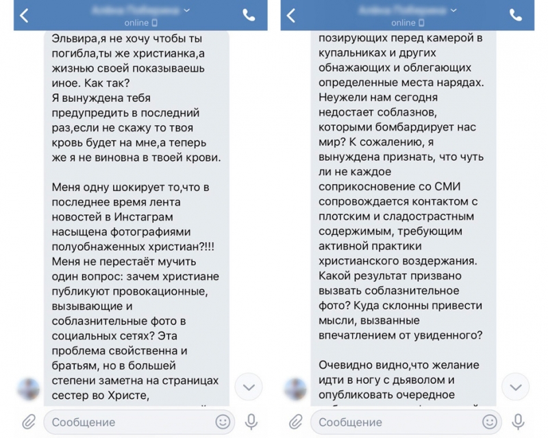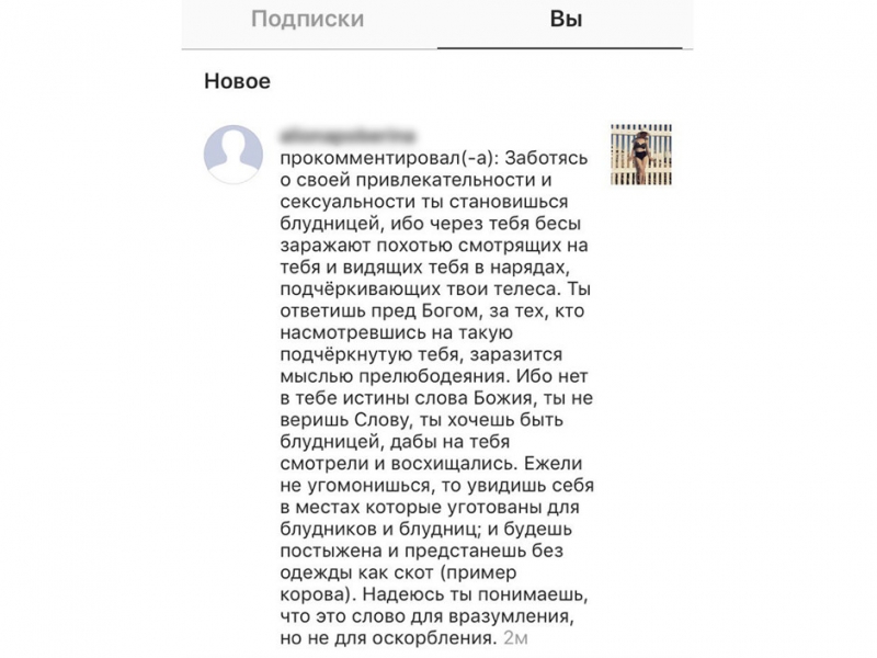 Через какое-то время эта женщина написала мне в личку и попросила удалить фотографию. Я ответила, что не собираюсь этого делать и попросила ее не смотреть, если ей что-то не нравится. Она написала длинное сообщение о том, что я оскорбляю чувства верующих. Я, не желая вступать в дискуссию, заблокировала ее.