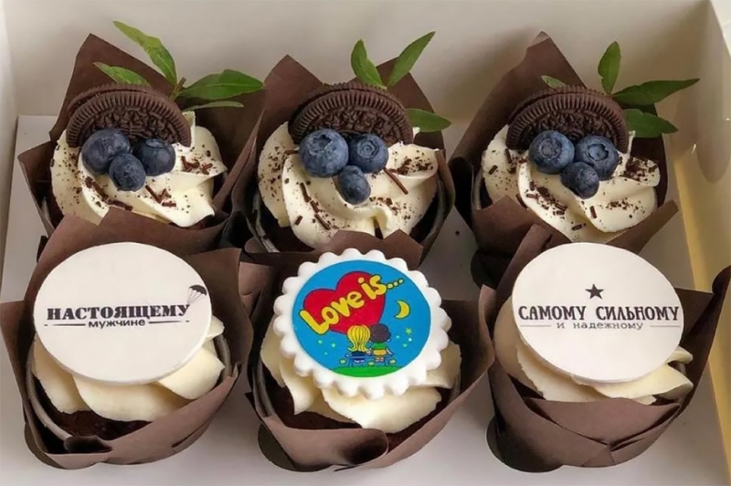 Подарите своему избраннику капкейки с забавными картинками и комплиментами, которые точно поднимут настроение. А для тех, кто заботится о здоровом питании, кондитер добавил ягодок сверху.