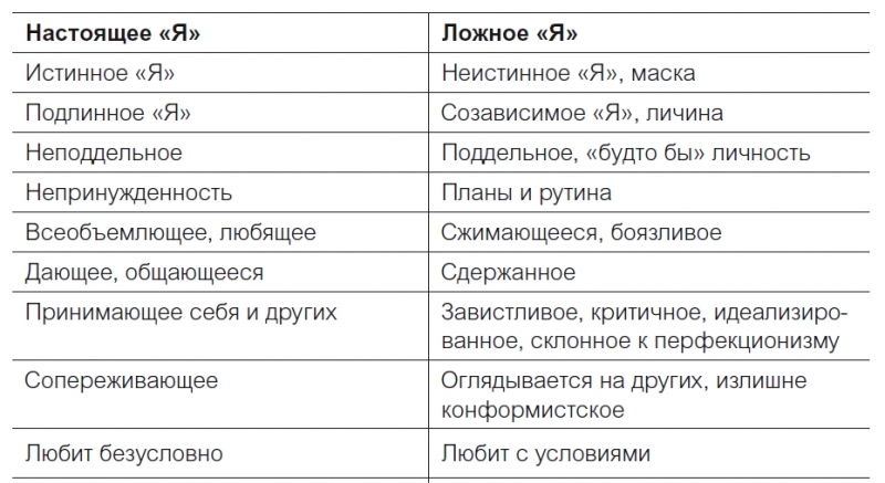Таблица из книги «Внутренний ребенок»Находиться в ложном «Я» вредно для нас: мы привыкаем занимать в жизни позицию жертвы, накапливаем психические и эмоциональные проблемы, чувствуем тревожность, страх, растерянность, пустоту. И в итоге становимся несчастными. Тем не менее выход есть: мы можем найти и исцелить своего внутреннего ребенка.