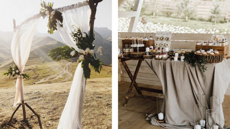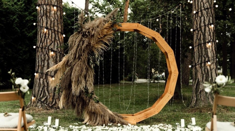 Отдайте предпочтение натуральным и органическим материалам (дереву, джуту, льняной ткани) и изделиям, выполненным в технике макраме. Они придадут свадебному пространству естественность и теплоту.