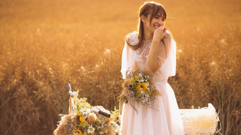Дополните его нежным венком из свежих или искусственных цветов, который подчеркнет женственность. Соберите букет из полевых трав и ярких пионов, например.