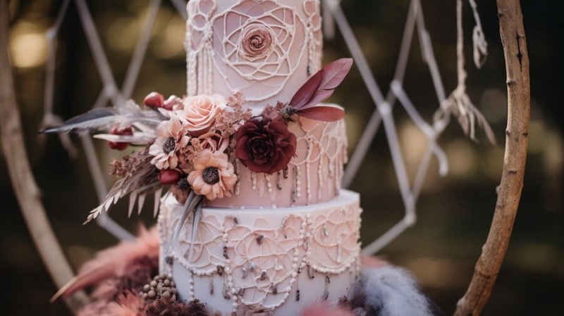 Украсьте торт цветами, ягодами или зеленью.Источник: Freepik.comСтиль бохо подчеркнут нежно-розовые оттенки торта.Источник: Freepik.comСоветы гостям, что надеть на свадьбу в стиле бохо